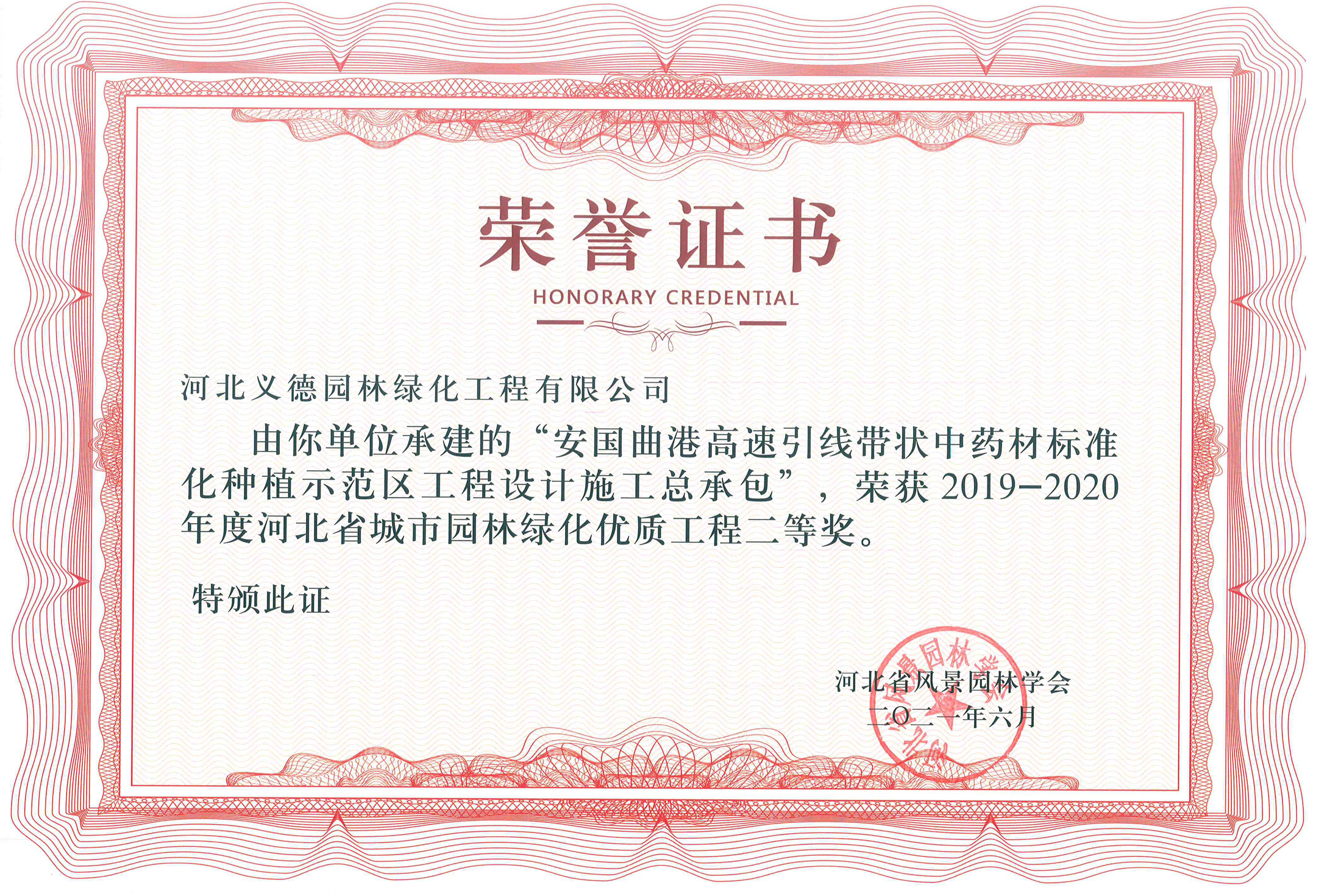 工程業績榮獲有2017-2018年度河北省城市園林綠化優質工程二等獎兩個;2019-2020年度河北省城市園林綠化優質工程二等獎兩個、三等獎兩個;2018至2020年保定市燕趙杯優質工程五個;2020年度石家莊市優質工程一個。